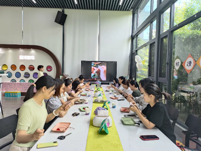 在中国传统习俗中,端午节戴香囊可以祛邪祈福。将香囊佩戴在胸前、腰际、脐中等处,香囊中的艾叶有清香、驱虫、避瘟、防病的功能。活动现场,工作人员向大家发放了由艾叶、针线、剪刀、布片等组成的材料包,大家通过观看制作视频,互帮互助,相互沟通,充分发挥想象力,从穿针引线、裁剪缝制、填充艾草再到钉扣收尾,每一步都认真细致。