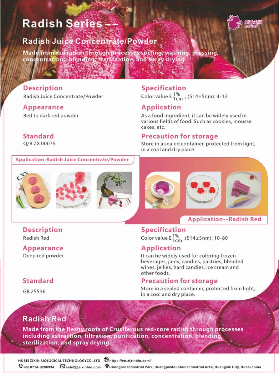 Using red carrot as raw material, the concentrated juice/powder of radish was prepared by washing, selecting, pressing, concentrating, blending, sterilization, spray drying and other processes.