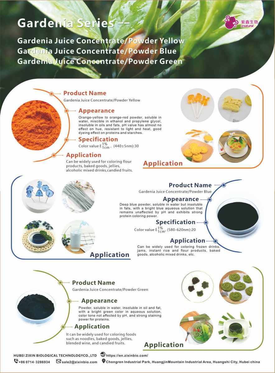 It can be widely used for coloring foods such as noodles, baked goods, jelly, blended wine, and candied fruits.