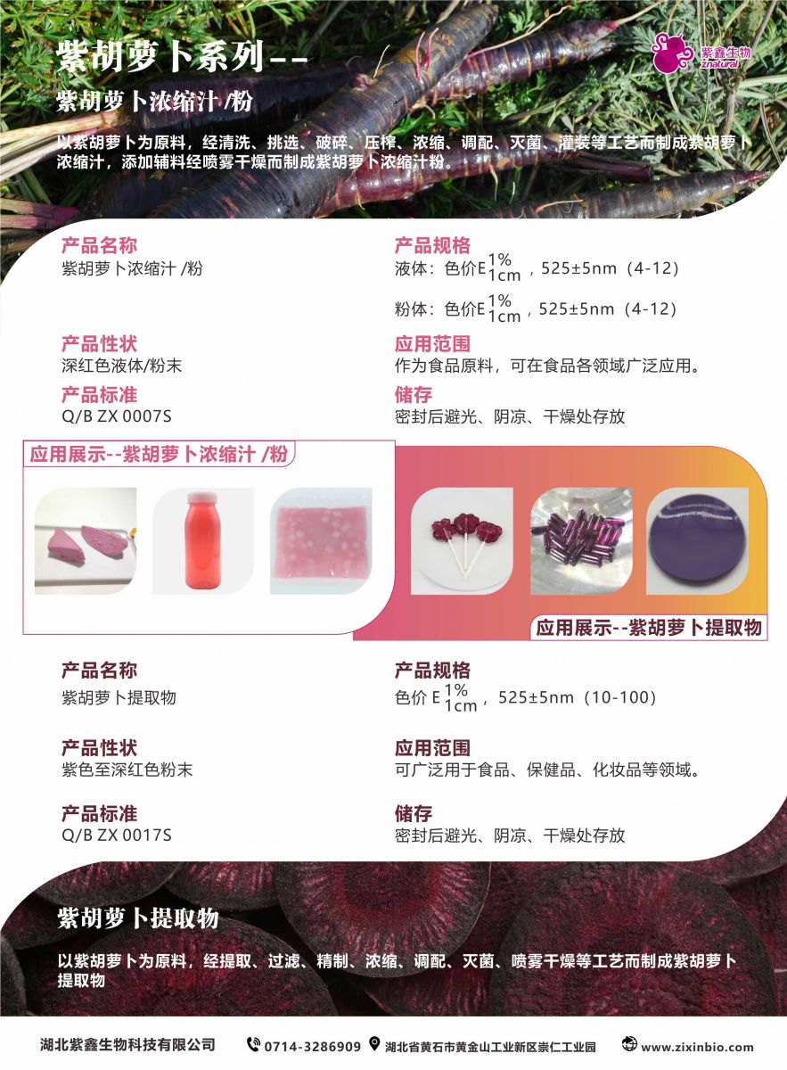 以紫胡萝卜为原料,经清洗、挑选、破碎、压榨、浓缩、调配、灭菌、灌装等工艺制成紫胡萝卜浓缩汁;