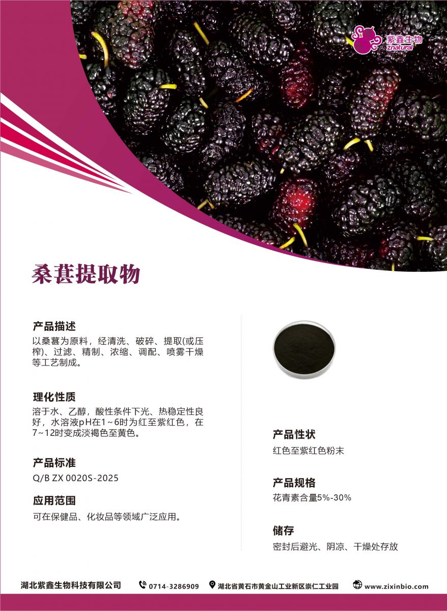 以桑葚为原料,经清洗、破碎、提取(或压榨)、过滤、精制、浓缩、调配、喷雾干燥等工艺制成。