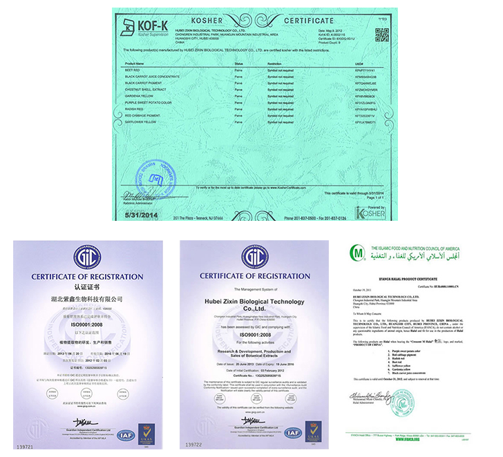 紫鑫生物为了确保产品的品质,采用国际先进的 HACCP 危害分析和关键控制点方法,从原辅料、半成品至成品全过程实行严格的质量控制,全程由 QA 检控,记录齐全,以保证产品的可追溯性。 公司始终如一的按照 GMP 要求组织生产,同时配备了高压液相色谱仪、气相色谱仪和紫外分光光度计等分析仪器,以确保产品各项指标符合相关标准。 质量源于生产过程,公司先后通过 ISO9001,Kosher 与 Halal 等质量体系认证。