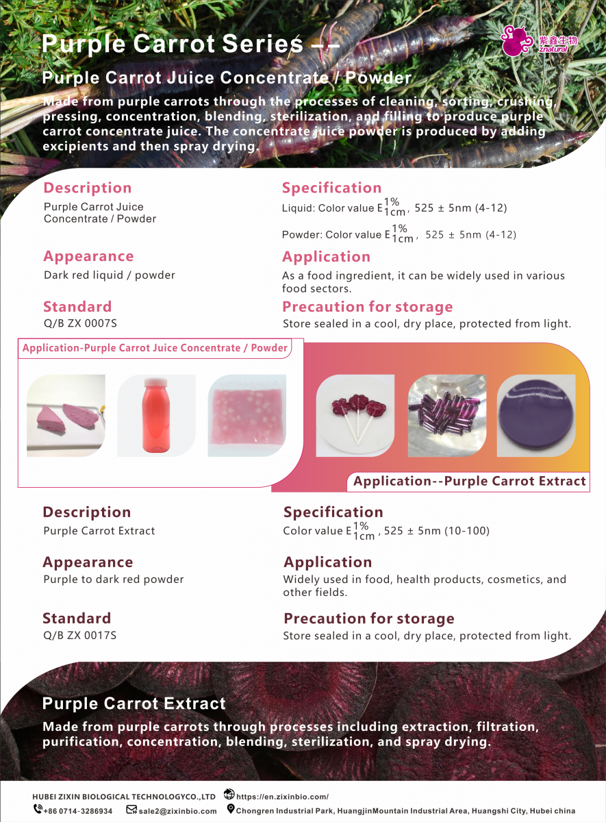 The purple carrot juice concentrate powder was further prepared by adding auxiliary materials and spray drying process.