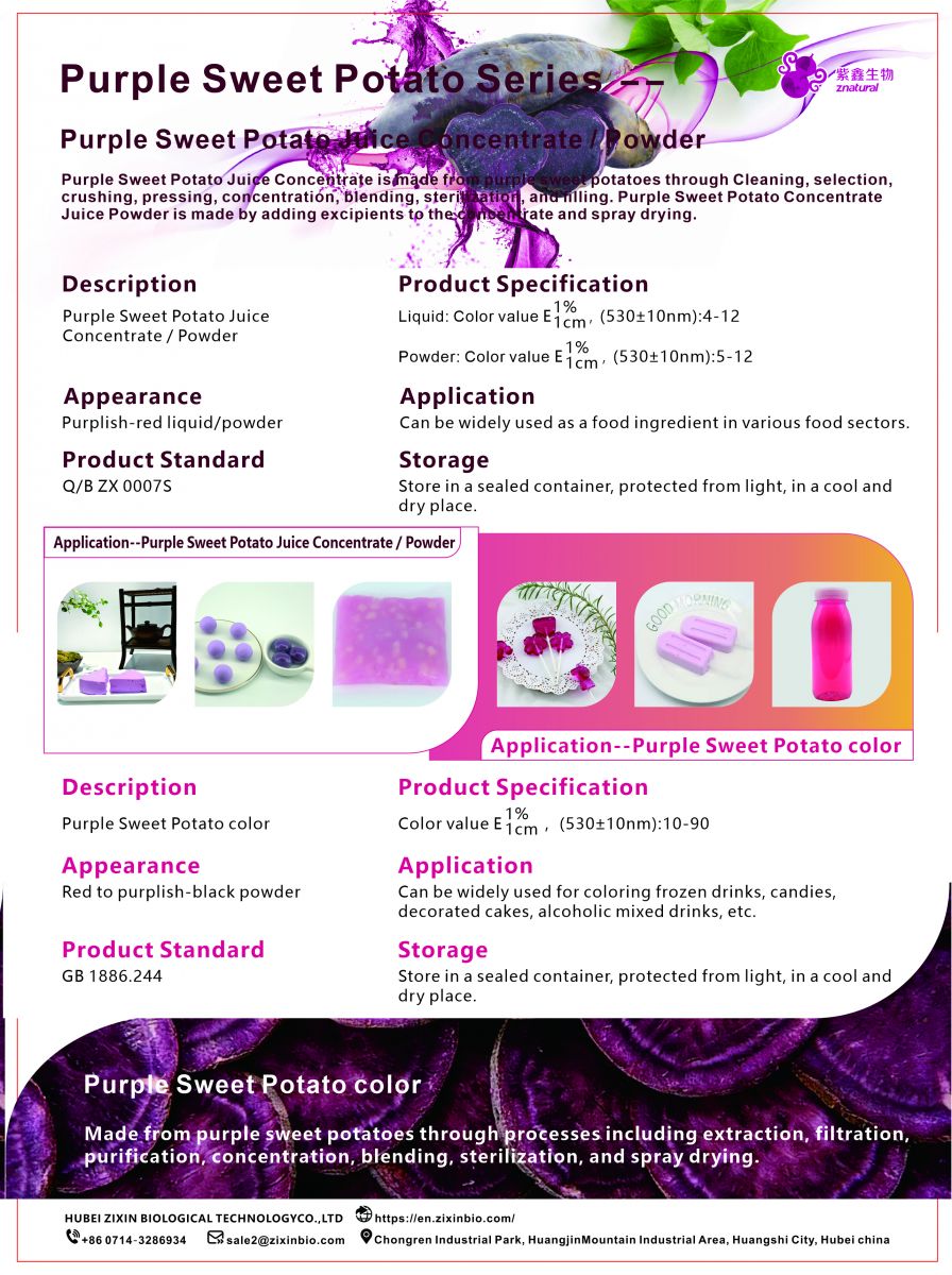 With purple sweet potato as raw material, the purple sweet potato concentrated juice is made through cleaning, selection, crushing, pressing, concentration, blending, sterilization, filling and other processes, and the auxiliary materials are added and dried by spray to make purple sweet potato concentrated juice powder.