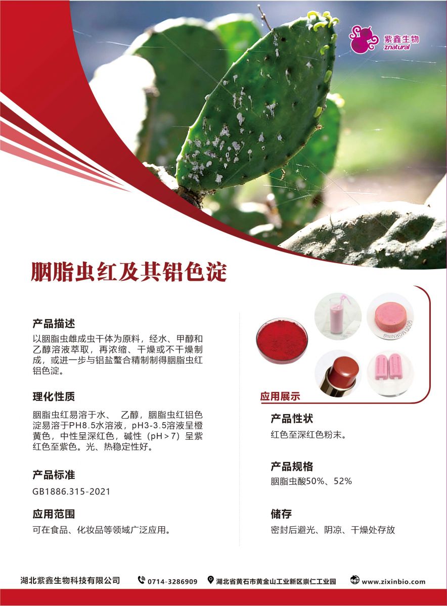 以胭脂虫雌成虫干体为原料,经水、甲醇和乙醇溶液萃取,再浓缩、干燥或不干燥制成;或进一步与铝盐螯合精制,制得胭脂虫红铝色淀。