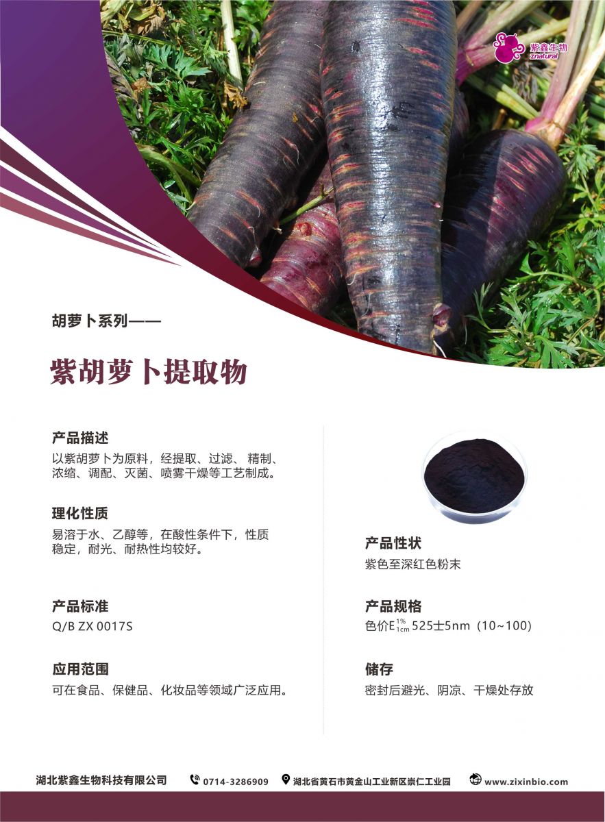 以紫胡萝卜为原料,经提取、过滤、精制、浓缩、调配、灭菌、喷雾干燥等工艺制成。